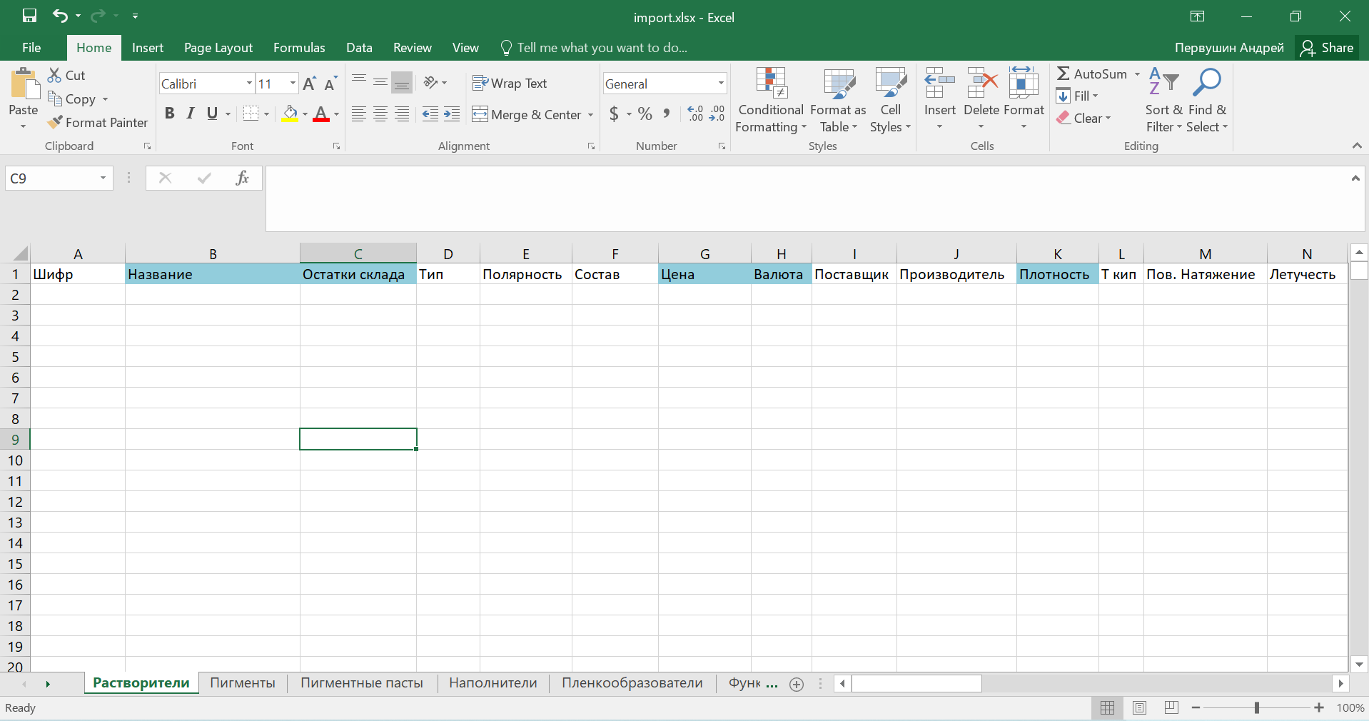 2) В файле несколько листов, каждый из которой соответствует своей категории: растворители, пигменты, наполнители, поставщики и т.д.